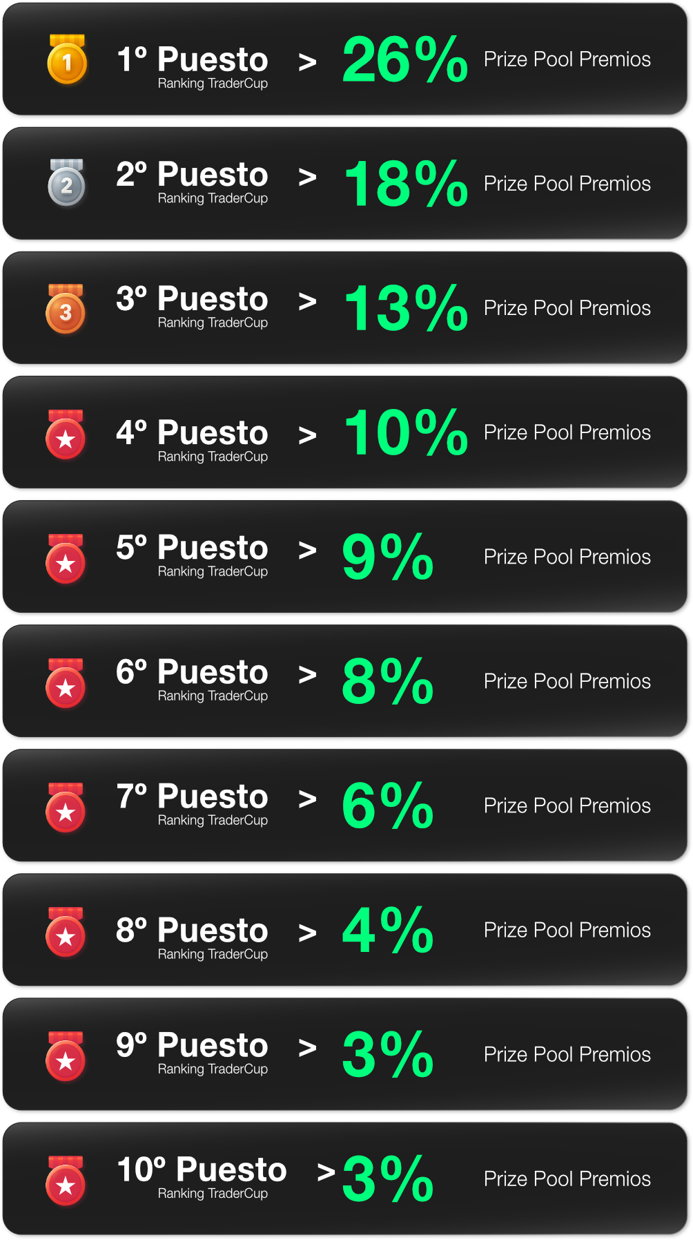 El 50% de todas las inscripciones va directo al Prize Pool de premios el cual se reparte, entre los 10 mejores traders, según los porcentajes que muestra la tabla.